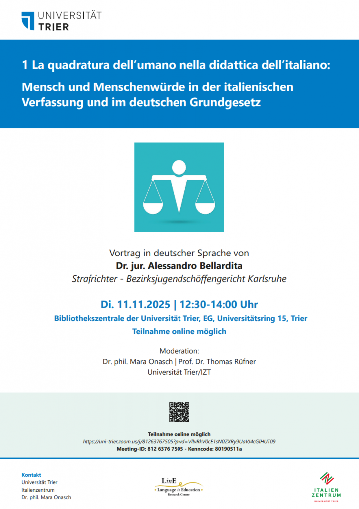 • IZT: Vortrag Dr. jur. Alessandro Bellardita – Mensch und Menschenwürde in der italienischenVerfassung und im deutschen Grundgesetz2. November 2025